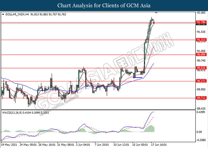 DOLLAR_INDX, H4: Dollar index was traded lower following prior retracement from the resistance level 91.80. MACD which illustrate diminishing bullish momentum signal suggest the pair to extend its retracement towards the support level 91.30.