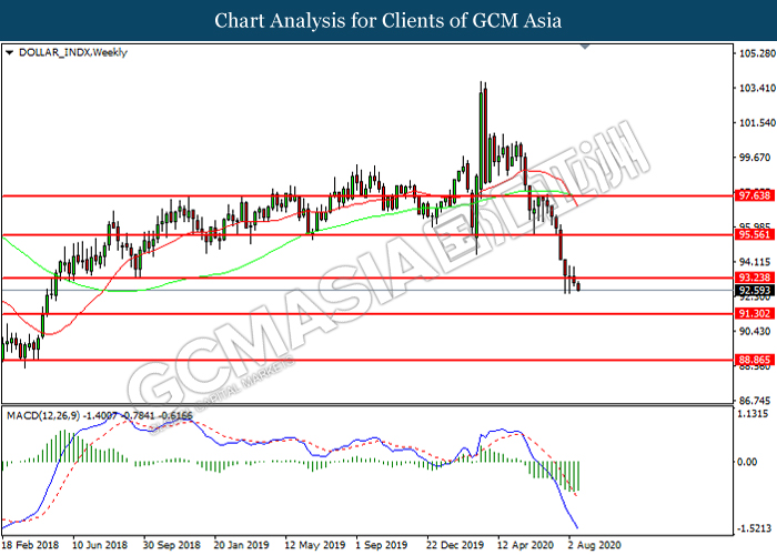 DOLLAR_INDX, Weekly: Dollar index was traded lower following prior breakout below the previous support level at 93.25. However, MACD which illustrated diminishing bearish momentum suggest the index to be traded higher in short-term as technical correction.