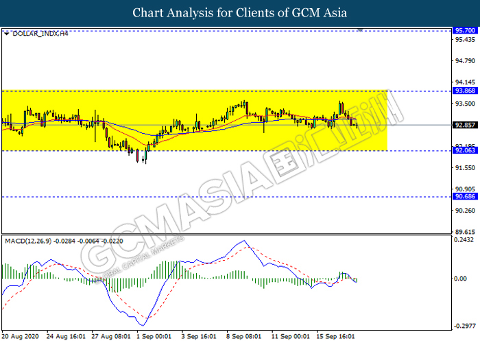 DOLLAR_INDX, H4: Dollar index remain traded in a sideway channel. However, MACD which illustrate bearish momentum suggest the dollar to be traded lower in short term towards the support level 92.05.