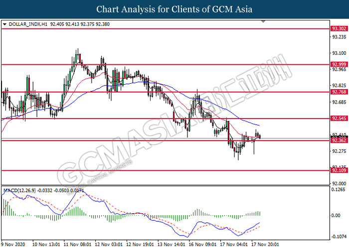 DOLLAR_INDX, H1: Dollar index was traded lower following prior retracement from the higher level. MACD which illustrate diminishing bullish momentum signal suggest the dollar to undergo technical correction toward the support level at 92.35.