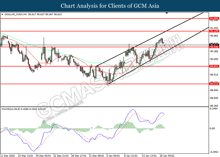 DOLLAR_INDX, H4: Dollar index was traded lower while currently testing the support level at 90.55. MACD which illustrated diminishing bullish momentum suggest the index to extend its losses after it successfully breakout below the support level.