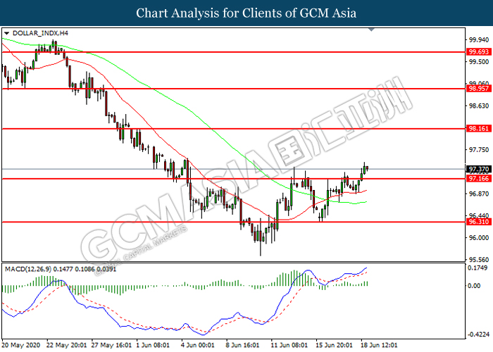 DOLLAR_INDX, H4: Dollar index was higher following prior breakout above the previous resistance level at 97.15. MACD which illustrated increasing bullish momentum suggest the index to extend its gains toward resistance level at 98.15.