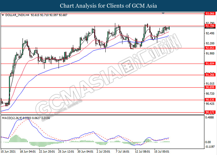 DOLLAR_INDX, H4: Dollar index was traded higher while currently testing the resistance level 92.70. MACD which ongoing illustrate bullish momentum signal with the formation of golden cross suggest the dollar to extend its gains after it breaks above the resistance level.