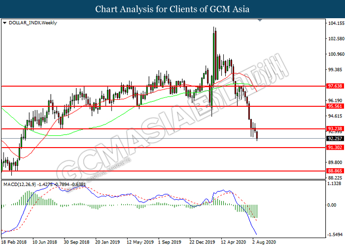 DOLLAR_INDX, Weekly: Dollar index was traded lower following prior breakout below the previous support level at 93.25. MACD which illustrated increasing bearish momentum suggest the index to extend its losses toward support level at 91.30.