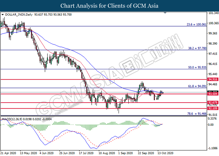 DOLLAR_INDX, Daily: Dollar index was traded higher following prior breakout above the previous resistance level at 93.50. MACD which illustrate diminishing bearish momentum signal suggest the dollar to extend its gains toward the resistance level at 94.10.