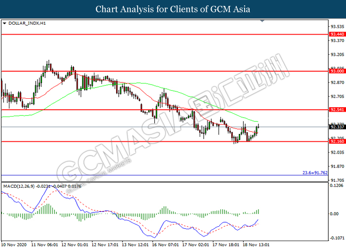 DOLLAR_INDX, H1: Dollar index was traded higher following prior rebound from the support level at 92.15. MACD which illustrated increasing bullish momentum suggest the index to extend its gains toward resistance level at 92.55.