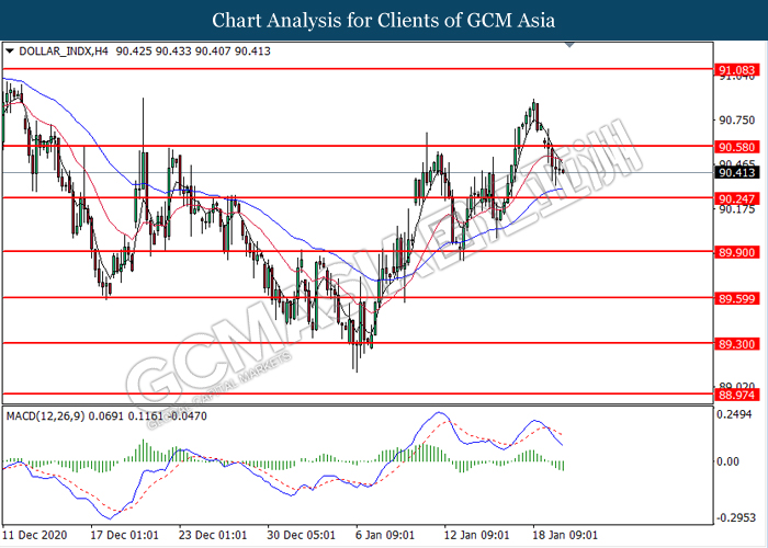 DOLLAR_INDX, H4: Dollar index was traded lower following prior breakout below the previous support level at 90.60. MACD which illustrated bearish bias momentum suggest the index to extend its losses toward the support level at 90.25.