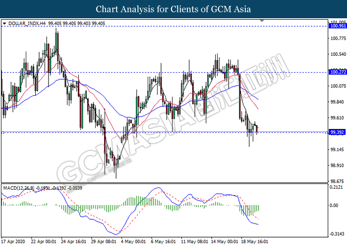 DOLLAR_INDX, H4: Dollar index was traded lower while currently testing the support level 99.40. MACD which illustrate ongoing bearish momentum signal suggest the dollar to extend its losses after it breaks below the support level.
