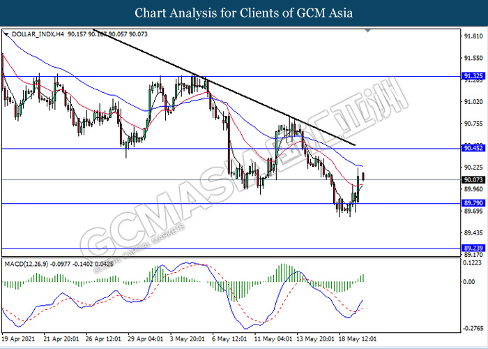 DOLLAR_INDX, H4: Dollar index was traded higher following prior rebound from the support level 89.80. MACD which illustrate bullish momentum signal with the formation of golden cross suggest the dollar to extend its gains towards the resistance level 90.45.