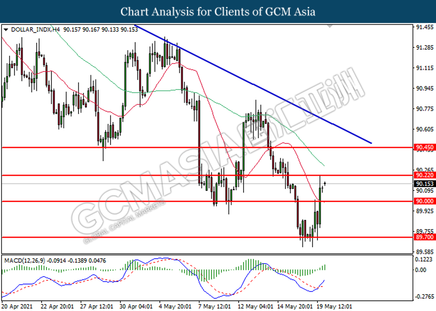 DOLLAR_INDX, H4: Dollar index was higher following a rebound near 89.70. MACD which illustrate bullish signal suggests the index to be traded higher in short-term as technical correction.