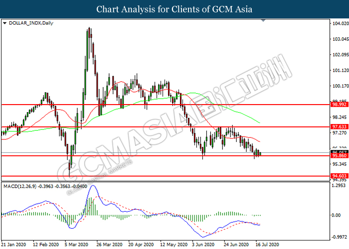 DOLLAR_INDX, Daily: Dollar index was traded lower while currently testing the support level 95.85. However, MACD which illustrated diminishing bearish momentum suggest the index to be traded higher in short-term as technical correction.
