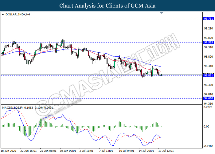 DOLLAR_INDX, H4: Dollar index was traded lower while currently testing the support level 95.85. MACD which illustrate bearish bias signal with the starting formation of death cross suggest the dollar to extend its losses after it breaks below the support level.