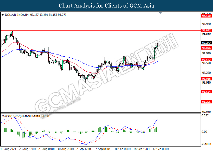 DOLLAR_INDX, H4: Dollar index was traded higher following prior breakout above the previous resistance level 93.10. MACD which illustrate persistent bullish momentum signal suggest the dollar to extend its gains towards the resistance level 93.70.