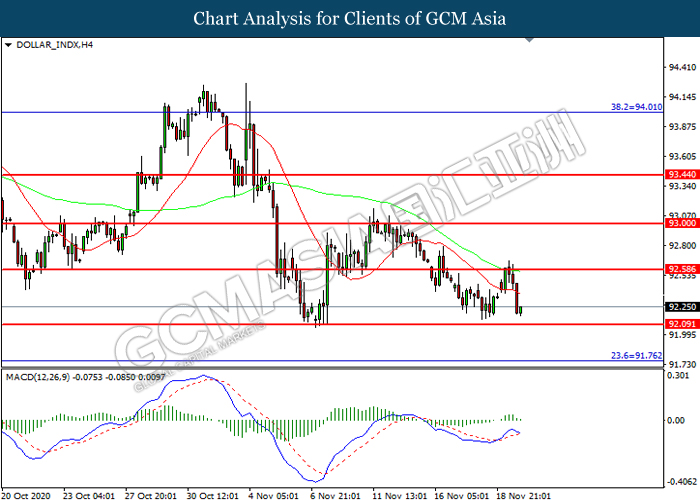 DOLLAR_INDX, H4: Dollar index was traded lower following prior retracement from the resistance level at 92.60. MACD which illustrated diminishing bullish momentum suggest the index to extend its losses toward support level at 92.10.