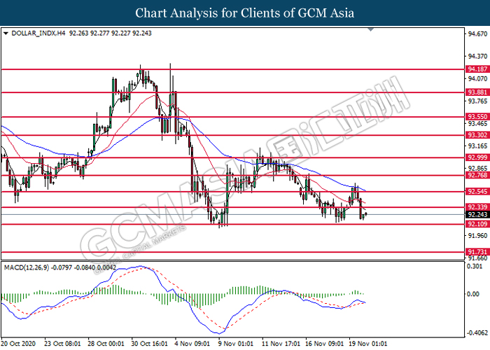 DOLLAR_INDX, H4: Dollar index was traded lower following prior breakout below the previous support level at 92.35. MACD which illustrate diminishing bullish momentum signal suggest the dollar to extend its losses toward the support level at 92.10.