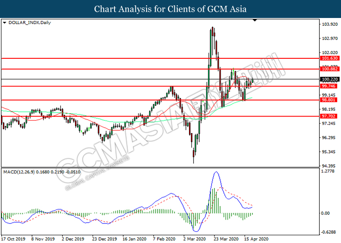 DOLLAR_INDX, Daily: Dollar index was traded higher following prior breakout above the previous resistance level at 99.75. MACD which illustrated diminishing bearish momentum suggest the index to extend its gains toward resistance level at 100.90.