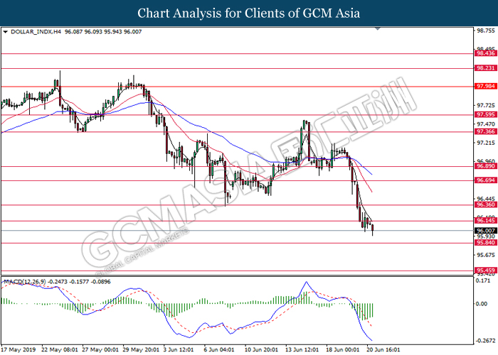 DOLLAR_INDX, H4: Dollar index was traded lower following prior breakout below the previous support level at 96.15. However, MACD which illustrate diminishing bearish momentum suggest index to undergo technical correction in short term toward the resistance level at 96.15.