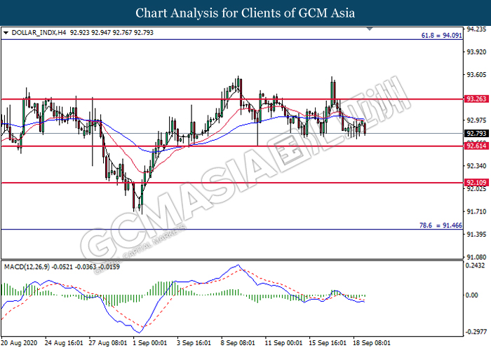 DOLLAR_INDX, H4: Dollar index was traded lower following prior retracement from the 20 (Red) and 50(Blue) moving average line. MACD which illustrated bearish bias momentum suggest the index to extend its losses toward the support level at 92.60.