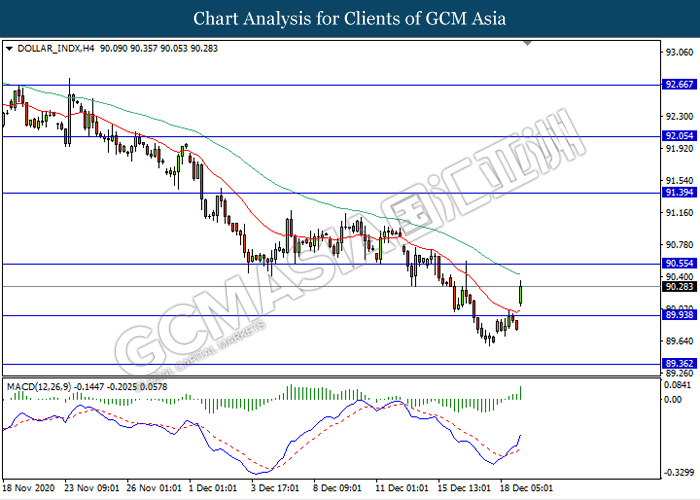 DOLLAR_INDX, H4: Dollar index was traded higher following prior breakout above the previous resistance level 89.95. MACD which illustrate bullish momentum signal with the formation of golden cross suggest the dollar to extend its gains towards the resistance level 90.55.