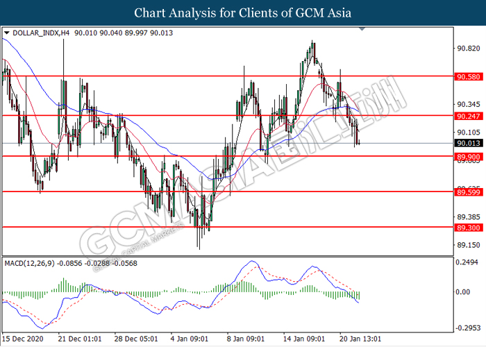 DOLLAR_INDX, H4: Dollar index was traded lower following prior breakout below the previous support level at 90.25. MACD which illustrated bearish bias momentum suggest the index to extend its losses toward the support level at 89.90.