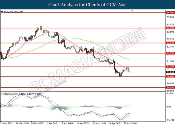 DOLLAR_INDX, H4: Dollar index was traded lower following prior retracement from the resistance level at 91.30. MACD which illustrated diminishing bullish momentum suggest the index to extend its losses toward support level at 90.80.