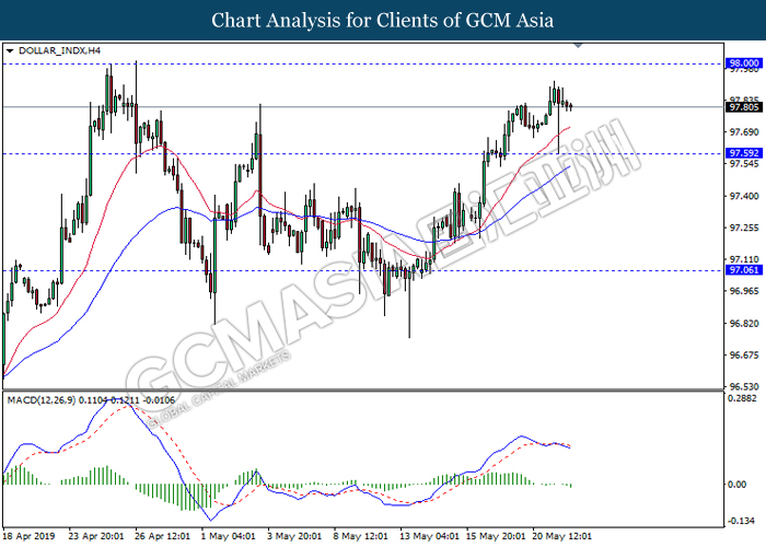 DOLLAR_INDX, H4: Dollar index was traded lower following recent retracement from the high level. MACD which illustrate bearish bias signal with the formation of death cross suggest the dollar to extend its retracement towards the support level 97.60