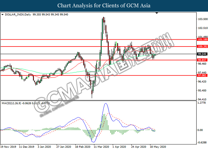 DOLLAR_INDX, Daily: Dollar index was traded higher following prior rebound form the support level at 98.85. MACD which illustrated diminishing bearish momentum suggest the index to extend its gains toward resistance level at 100.40.