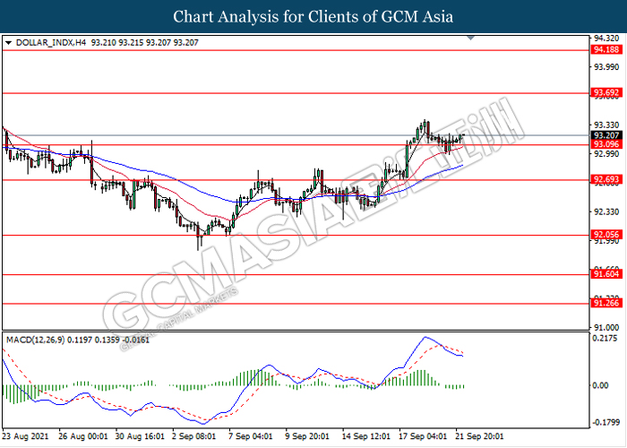 DOLLAR_INDX, H4: Dollar index was traded higher following prior rebound from the support level 91.10. MACD which illustrate diminishing bearish momentum signal suggest the dollar to extend its gains towards the resistance level 91.70.