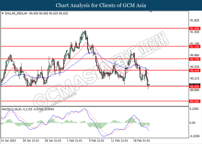DOLLAR_INDX, H4: Dollar index was traded lower while currently testing the support level at 90.00. MACD which illustrated bearish bias momentum suggest the index to extend its losses after it successfully breakout below the support level at 90.00.
