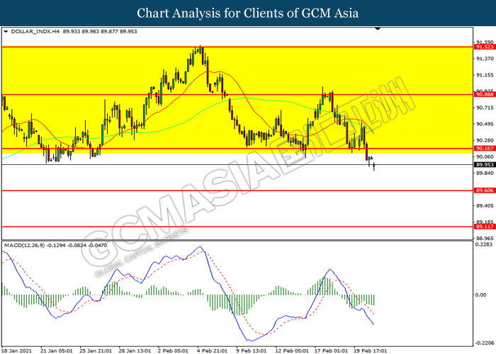 DOLLAR_INDX, H4: Dollar index was traded lower following prior breakout below the previous support level at 90.15. MACD which illustrated increasing bearish momentum suggest the index to extend its losses toward support level at 89.60.
