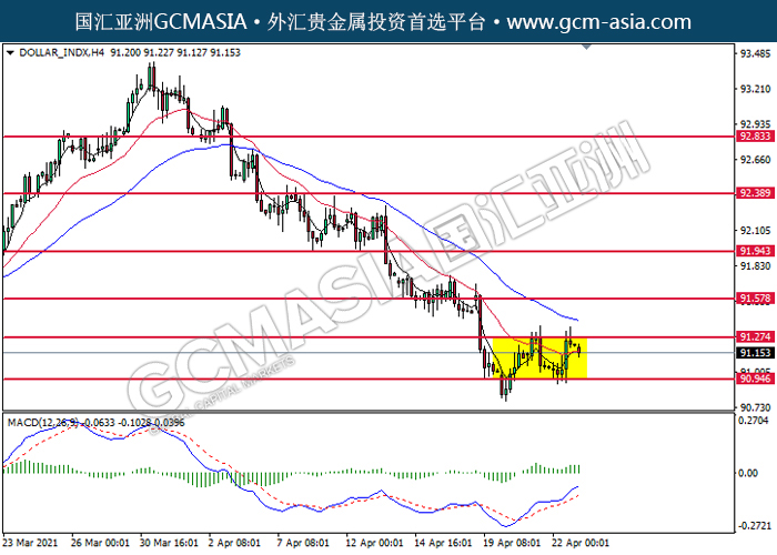 DOLLAR_INDX, H4: Dollar index was traded lower following prior retracement from the resistance level at 91.25. MACD which illustrated diminishing bullish momentum suggest the index to extend its losses toward the support level at 90.95.