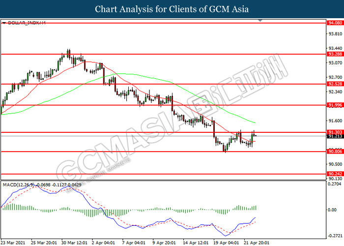 DOLLAR_INDX, H4: Dollar index was traded higher while currently testing the resistance level at 91.30. MACD which illustrated increasing bullish momentum suggest the index to extend its gains after it successfully breakout above the resistance level.