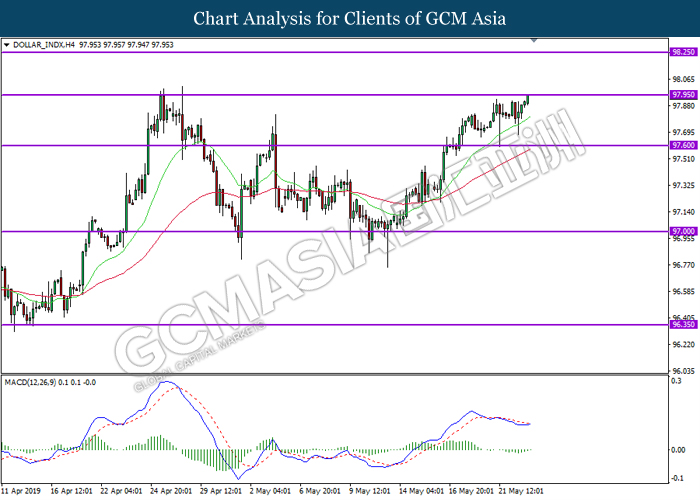 DOLLAR_INDX, H4: Dollar index was traded higher while currently testing the resistance level 97.95. MACD which illustrate bullish bias signal suggest index to extend its gains after successfully breaking above the resistance level.