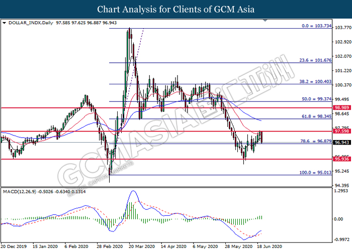 DOLLAR_INDX, Daily: Dollar index was traded lower while currently testing the support level at 96.85. MACD which illustrate diminishing bullish momentum signal suggest the pair to extend its losses after it successfully breakout below the support level at 96.85.