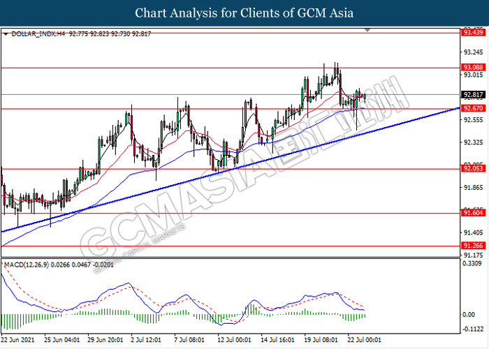 DOLLAR_INDX, H4: Dollar index was traded higher following recent rebound from the support level 92.65. MACD which illustrate diminishing bearish momentum signal suggest the dollar to extend its rebound towards the resistance level 93.10.