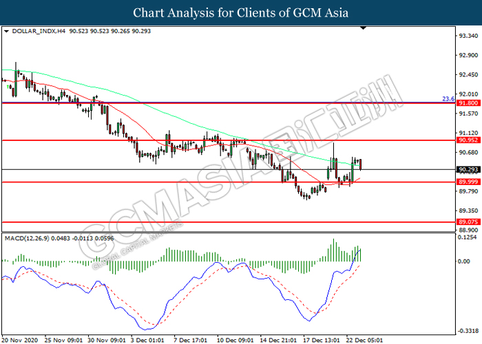 DOLLAR_INDX, H4: Dollar index was traded higher following prior rebound from the support level at 90.00. However, MACD which illustrated diminishing bullish momentum suggest the index to be traded lower in short-term as technical correction.