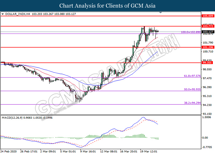 DOLLAR_INDX, H4: Dollar index was traded lower following prior retracement from the resistance level at 103.75. MACD which illustrate bearish bias momentum suggest the dollar to extend its losses toward the support level at 102.90.