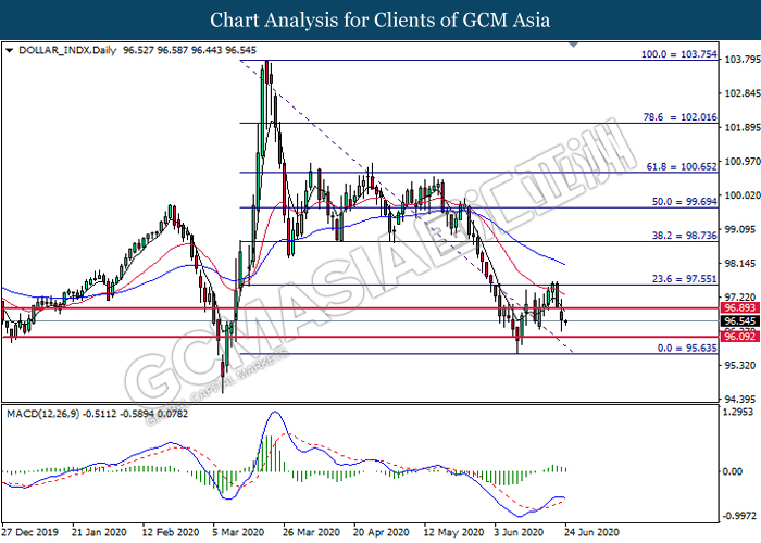 DOLLAR_INDX, Daily: Dollar index was traded lower following prior breakout below the previous support level at 96.90. MACD which illustrate diminishing bullish momentum signal suggest the pair to extend its losses toward the support level at 96.10.