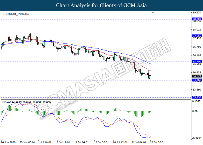 DOLLAR_INDX, H4: Dollar index was traded lower while currently testing near the support level 94.35. However, MACD which illustrate diminishing bearish momentum suggest the dollar to experience a technical correction towards the resistance level 95.70.