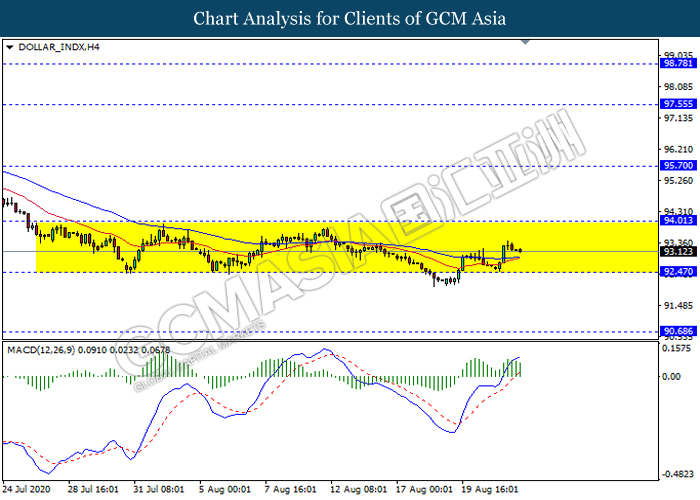 DOLLAR_INDX, H4: Dollar index remain traded in a sideway channel. However, MACD which illustrate bearish momentum signal suggest the dollar to be traded lower in short term towards the support level 92.45.