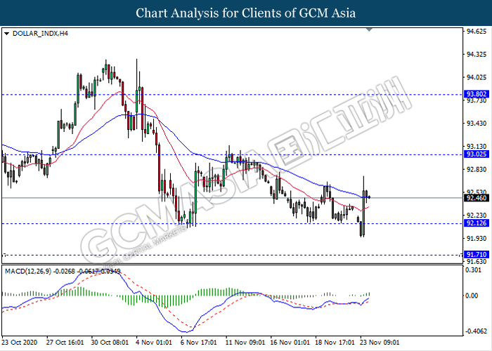 DOLLAR_INDX, H4: Dollar index was traded higher following prior rebound from the support level 92.10. MACD which illustrate bullish momentum signal suggest the dollar to extend its gains towards the resistance level 93.00.