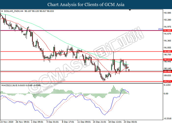 DOLLAR_INDX, H4: Dollar index was traded lower while currently testing the support level at 90.00. MACD which illustrated increasing bearish momentum suggest the index to extend its losses after it successfully breakout below the support level.