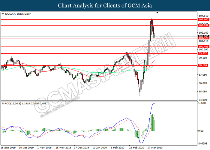DOLLAR_INDX, Daily:Dollar index was traded lower while currently testing the support level at 101.40. MACD which illustrated diminishing bullish momentum suggest the index to extend its losses after it successfully breakout below the support level.