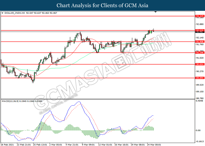 DOLLAR_INDX, H4: Dollar index was traded higher while currently testing the resistance level at 92.55. However, MACD which illustrated diminishing bullish momentum suggest the commodity to be traded lower in short-term as technical correction.