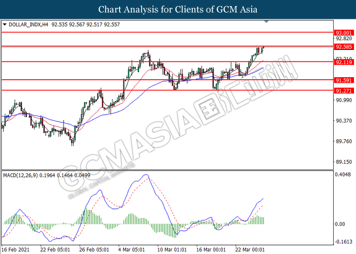 DOLLAR_INDX, H4: Dollar index was traded higher while currently testing the resistance level at 92.60. MACD which illustrated bullish bias momentum suggest the index to extend its gains after it successfully breakout above the resistance level.