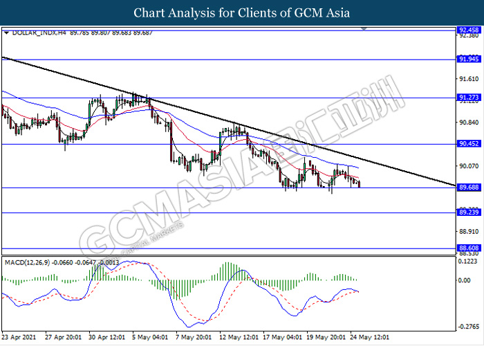 DOLLAR_INDX, H4: Dollar index was traded lower while currently testing the support level 89.70. MACD which illustrate diminishing bullish momentum signal with the formation of death cross suggest the dollar to extend its losses after it breaks below the support level.