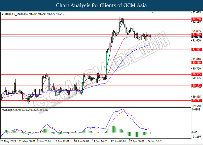 DOLLAR_INDX, H4: Dollar index was traded flat near the resistance level 91.75. However, MACD which illustrate bearish momentum signal suggest the dollar to extend its losses towards the support level 91.30.