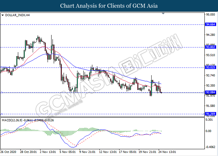 DOLLAR_INDX, H4: Dollar index was traded lower while currently testing the support level 92.10. MACD which illustrate bearish bias signal with the formation of death cross suggest the dollar to extend its losses after it breaks below the support level.