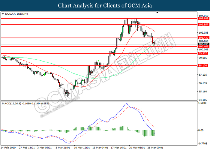 DOLLAR_INDX, H4:Dollar index was traded lower while currently near the support level at 100.40. MACD which illustrated increasing bearish momentum suggest the index to extend its losses after it successfully breakout below the support level.