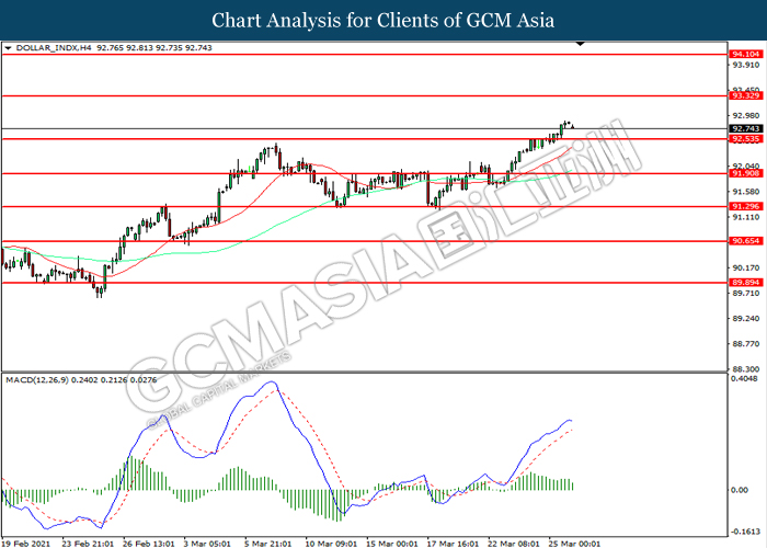 DOLLAR_INDX, H4: Dollar index was traded higher following prior breakout above the previous resistance level at 92.35. However, MACD which illustrated diminishing bullish momentum suggest the index to be traded lower in short-term as technical correction.